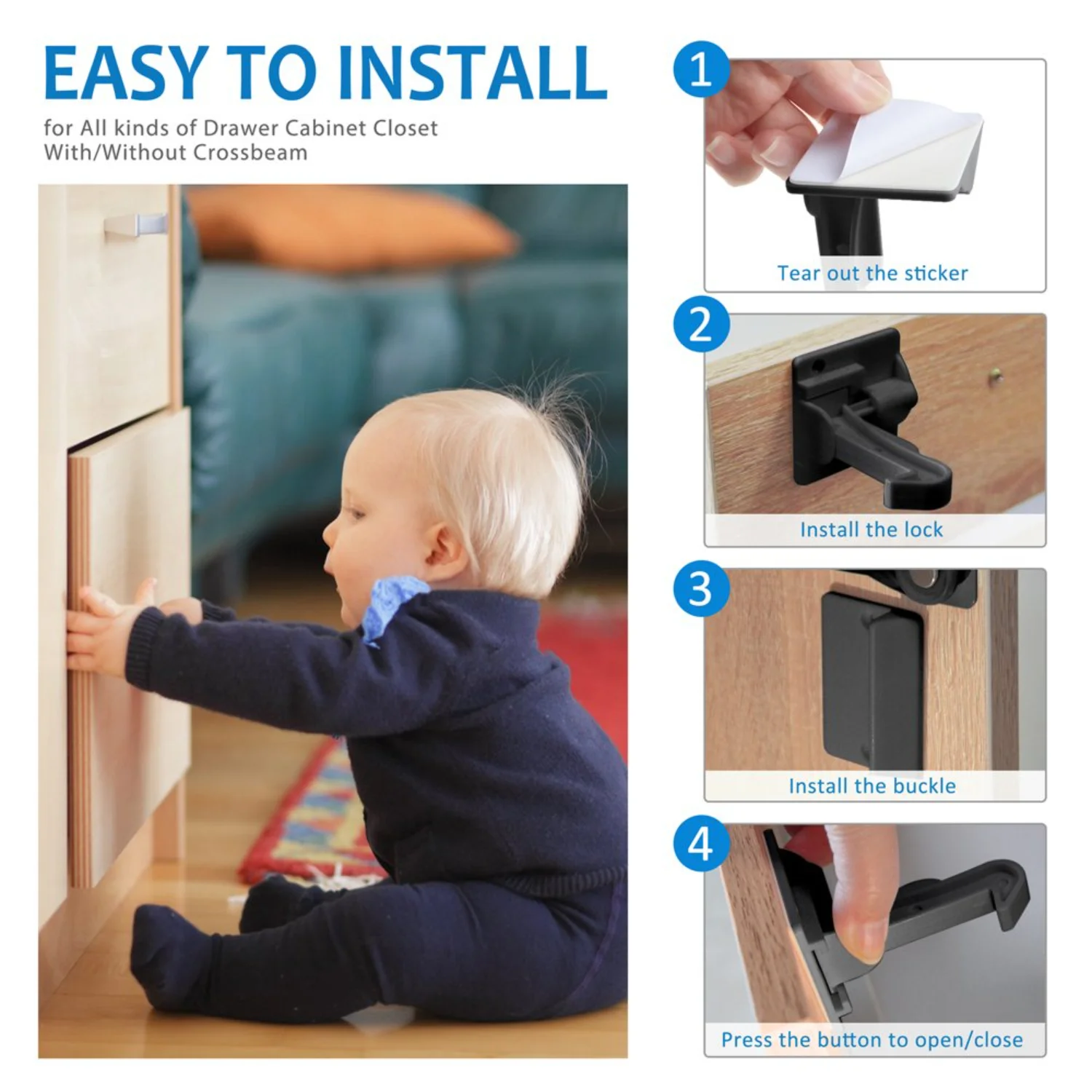 NEWCE 10 Pack Invisible Baby Proof Drawer Cabinet Locks Latches - Easy Installation, No Drill, Tools or Keys Required, Child