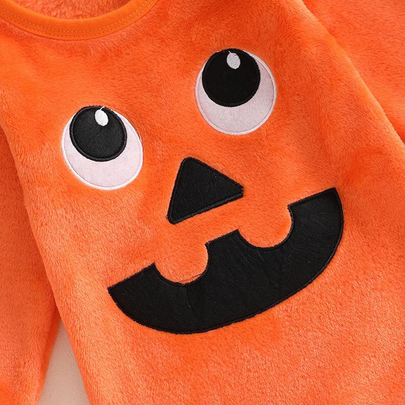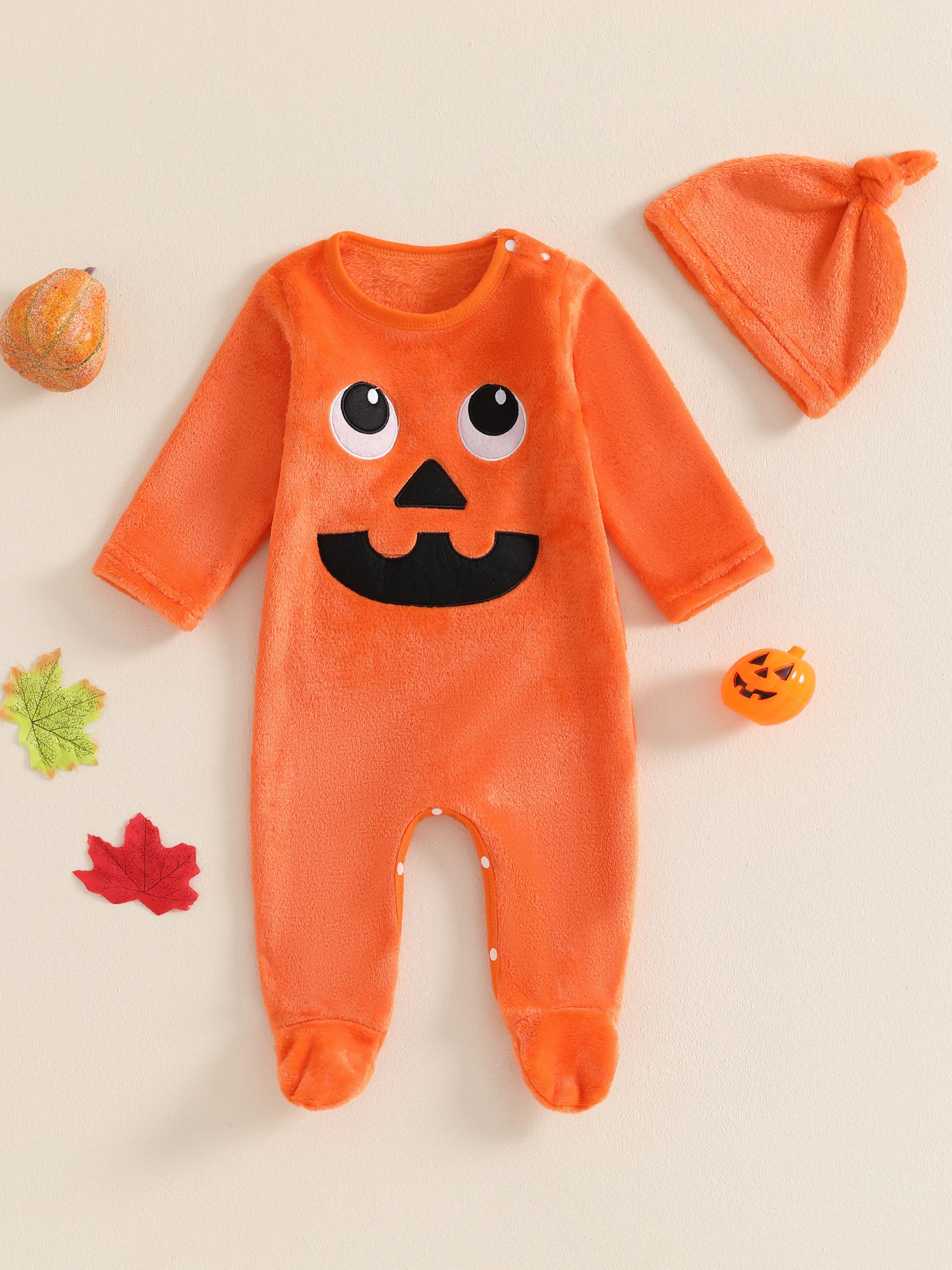 Toddler Boys Spooky Halloween Costume Set with Pumpkin Print Romper Long Sleeve Crew Neck Jumpsuit and Matching Hat
